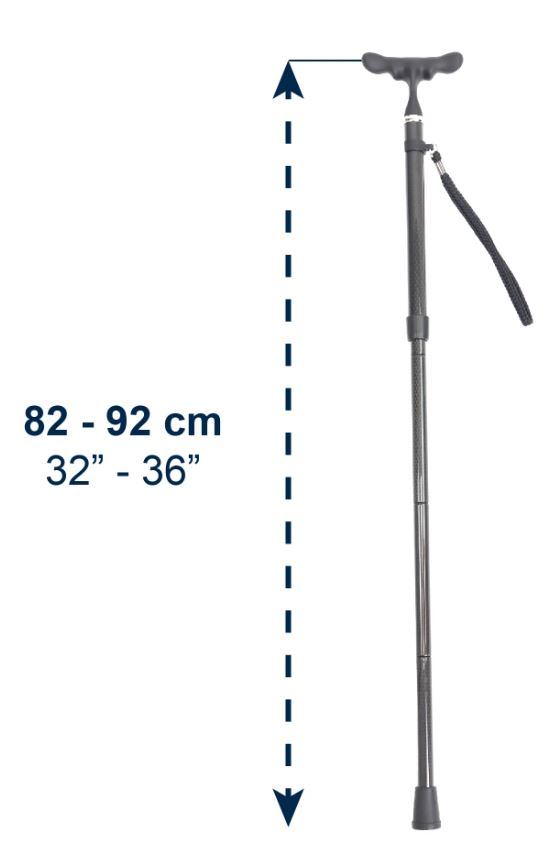 Folding design and fabric case for convenient storage and transport; perfect for everyday use. Adjustable from 82 cm to 92 cm, it fits people from 1.55 m to 1.85 m tall, ideal for seniors, people with reduced mobility, or those in recovery who need light and secure support while walking.