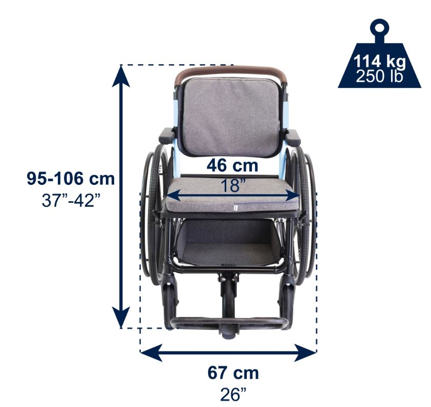 The minimalist design of the 60 cm rear wheels with anti-slip tread allows for safe self-propulsion by the user. In addition, a wide padded seat (46 x 40 cm), comfortable backrest, and armrests that fold to a vertical position facilitate lateral transfers and improve ergonomics for daily use