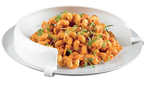 Clips to edge of plate to prevent food from sliding off dish, helps reduce kitchen mess after eating, creates an edge making it easier to scoop foo.